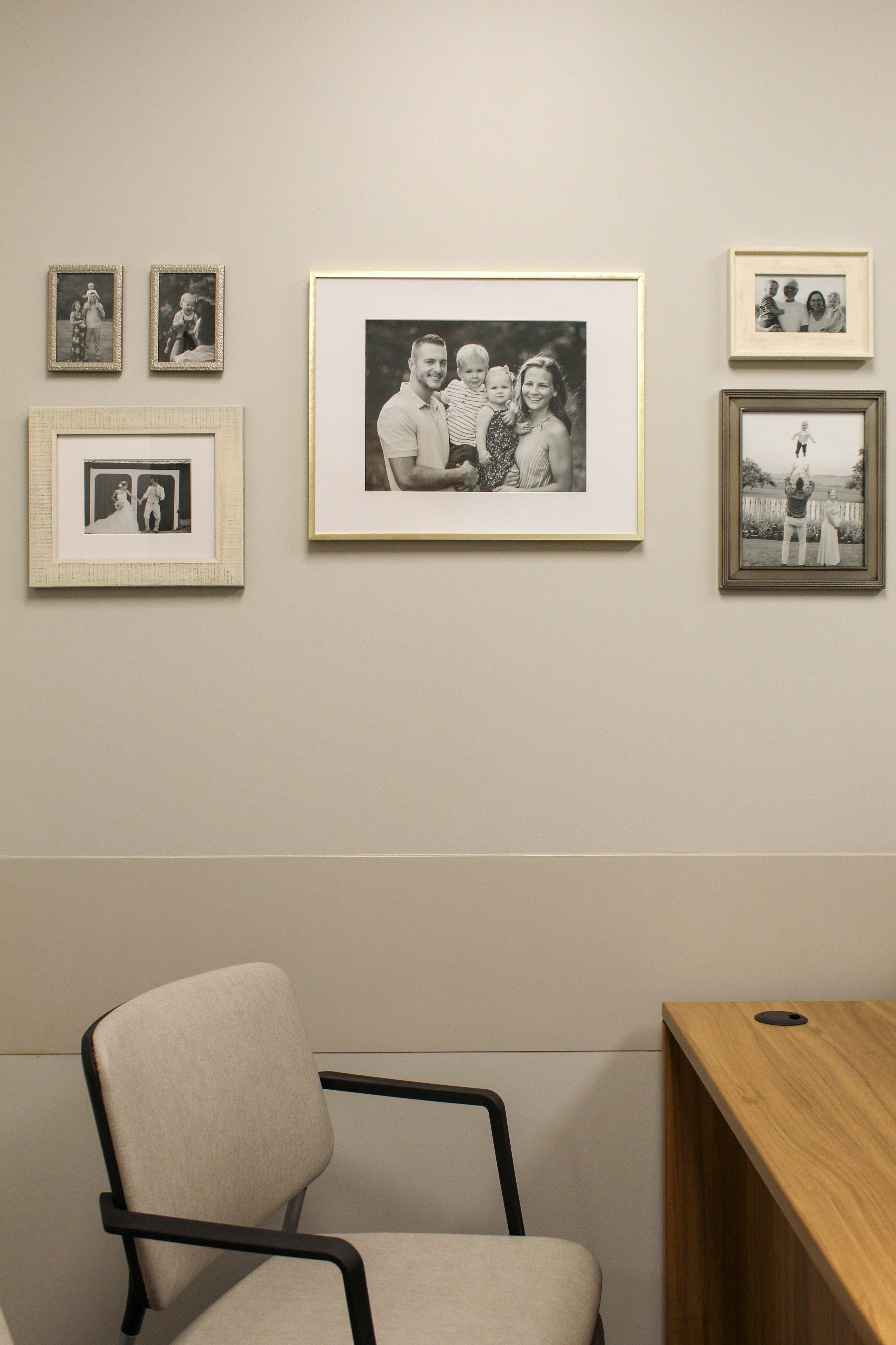 On the wall to the other wide of his desk, I also included a gallery wall of black and white family photos. Justin faces this wall when seated at his desk and he wanted to be able to see us throughout his day (melt my heart!) I chose a mixed finish look with gold, silver, and light wood frames and kept all the pictures black and white for a more coordinated look.