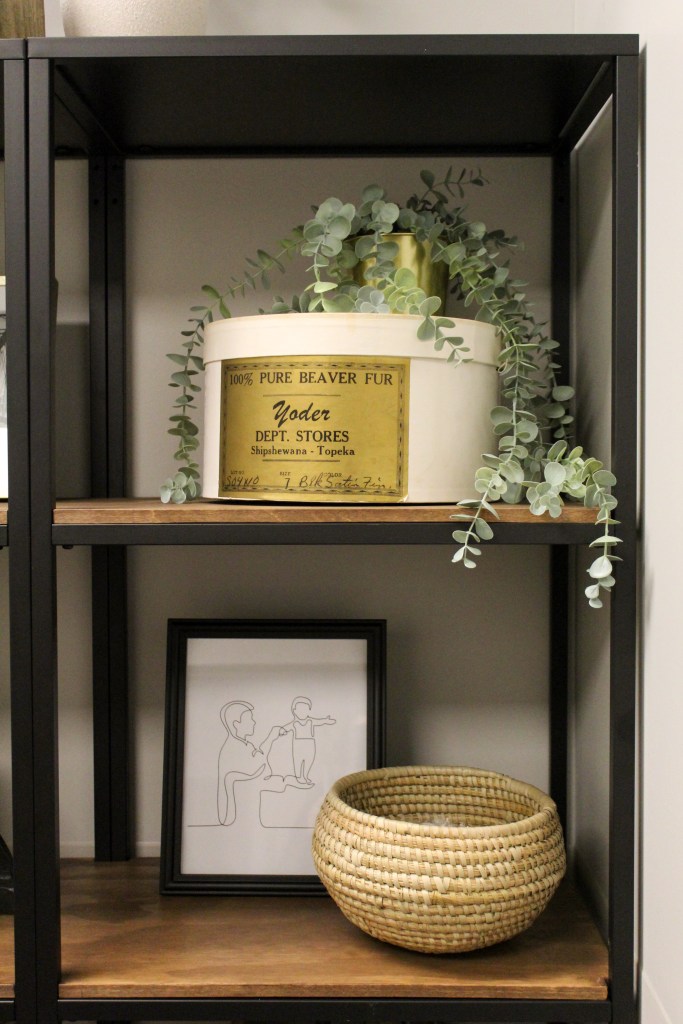 I wanted to be very intentional about sprinkling little tidbits of Justin’s personality throughout the bookcase. A beer stein from a trip he took to Europe, a hat box that belonged to his maternal grandfather, and a little wooden engraving of The Lord’s Prayer given to him by his paternal grandparents – these sentimental items reflect his history and heritage.